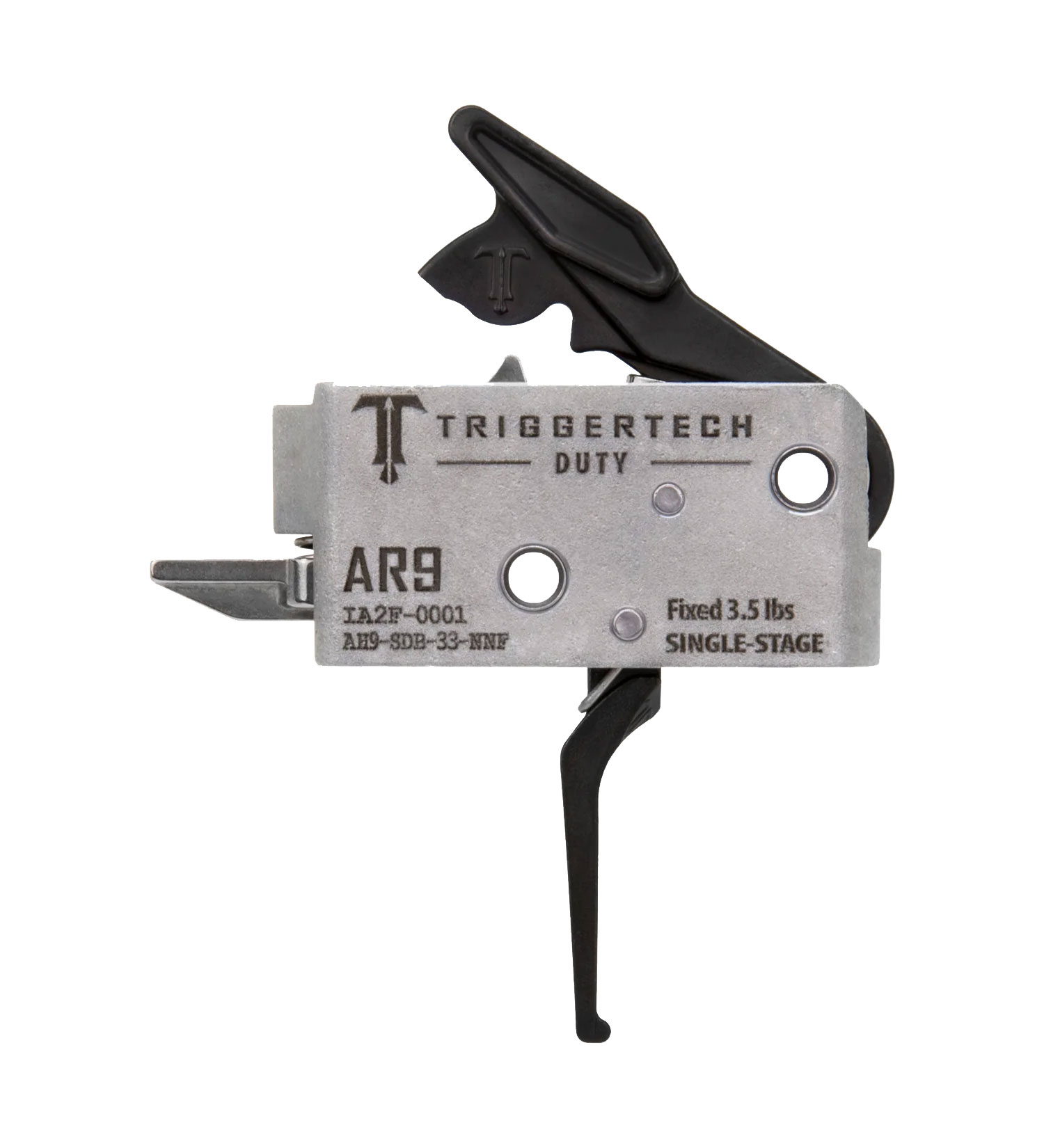 Description: TriggerTech Duty Single Stage AR-9 Trigger, Black Flat Trigger. The Duty Single-Stage Trigger is developed with military and law enforcement in mind. The Duty-series triggers feature double the pull weight and length of the first stage and a more forceful reset. This provides a more tactile feel to every trigger pull, making every shot more certain. This trigger assembly is designed for Mil-Spec AR-9 firearms and features a fixed 3.5 lbs single-stage pull weight with a flat trigger shoe. As with other TriggerTech trigger lines, the Duty-series still has the Zero Creep, TKR, CLKR, and FLTWR technologies that TriggerTech is known for.
