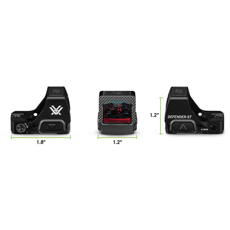 Description: Vortex Defender-ST 6 MOA Red Dot. From handguns to shotguns, the Defender-ST red dot is as versatile as your shooting interests. Whether this optic is part of your everyday carry setup or topping your favorite turkey gun, the large ultra-clear window is the perfect size for a smooth draw out of concealment and wide enough to quickly acquire the dot on that fast-moving tom.