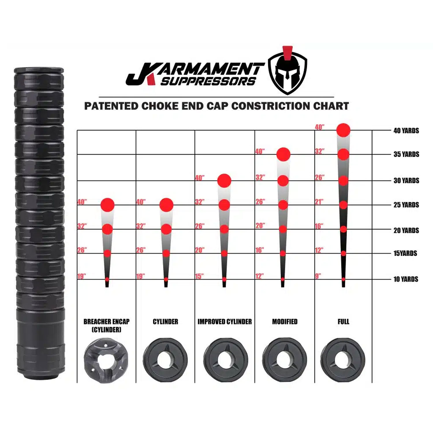 In just seconds and without specialized tools, the VERSAX 12GA's front choke cap can be swapped out to switch between various levels of shot pattern constriction. A cylinder bore choke cap is included. The VERSAX 12GA is the first and only shotgun suppressor on the market that correctly and variably shapes your shot pattern to suit your use. It's the only shotgun suppressor that won't hold you back when a tight shot pattern is required, such as with skeet, trap, and bird hunting.